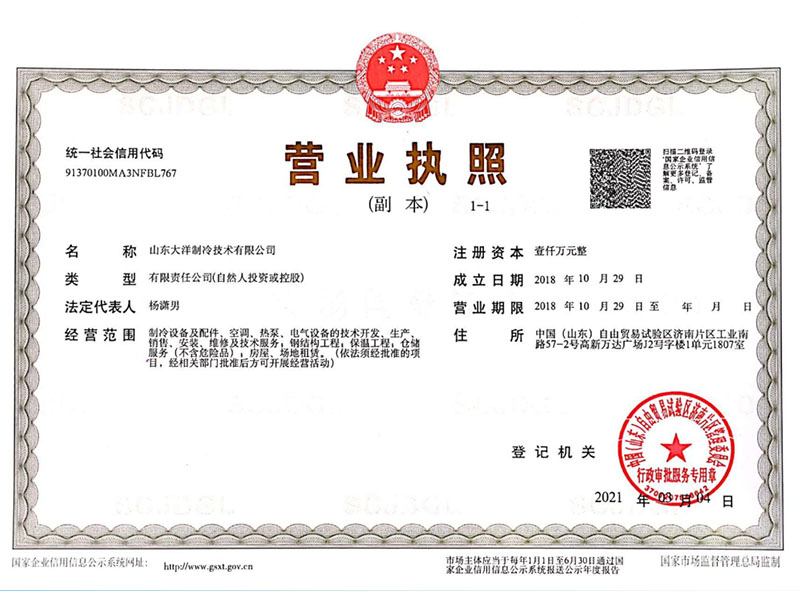 山東大洋制冷 · 資質證書